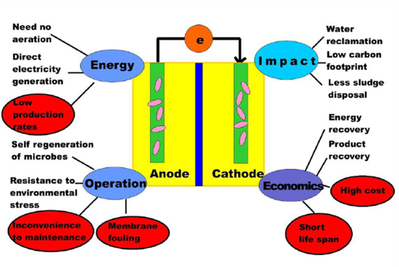 Increasing demand for renewable energy in the backdrop of climate change realities, human-induced global change and environmental pollution calls for waste valorisation and circular economy [1]. Growing environmental and public health concerns demand sustainable wastewater treatment [2]. Increasing desire for clean water, resource and energy recovery, pollutant removal led to the development of sustainable green technologies. In this regard, the growth of biological fuel cells is a significant development in the renewable energy paradigm [3]. Nevertheless, the conceptual development of fuel cells started from the work of William Groves in 1839 [4]. Biological fuel cells are devices capable of generating electrical energy from chemical energy through the use of biocatalyst and electrochemical reactions. In such type of fuel cells, the organic-rich substrates are oxidized in the anode compartment through the action of microorganisms which releases the degradation products such as electrons, protons and carbon dioxide. The electrons released reach the anode and subsequently transported to the cathode. The hydrogen crosses the proton exchange membrane to reach the cathode compartment. The electrons are accepted by the electron acceptor such as oxygen in the cathode. The electron and proton reduced in the cathode compartment to form water or other products. MFCs are a promising green technology that has been found to be applied in wastewater treatment including nutrient removal and recovery, organic removal and pollutant removal [5, 6]. Several studies reported the application of MFC in wastewater treatment namely treatment of domestic wastewater [7, 8], cattle manure, brewery wastewater [9], and waste sludge [10, 11]. Application of MFC in the wastewater treatment provides multiple benefits namely bioelectricity generation offsets to a certain extent the wastewater treatment process; pollution reduction and removal [3]. Nevertheless, the MFC technology is replete with issues such as low power density, high initial capital investment, difficulty in scaling-up, electrode and MFC configuration, exoelectrogens activity in complex wastewater environment and electrode performance limiting factors [2, 6]. This paper provides critical insights about the MFC processes, application of MFCs in wastewater treatment, and challenges of MFC technology.