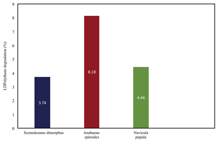 Fig. (2). Percentage degradation of long density polythene by different microalgae.