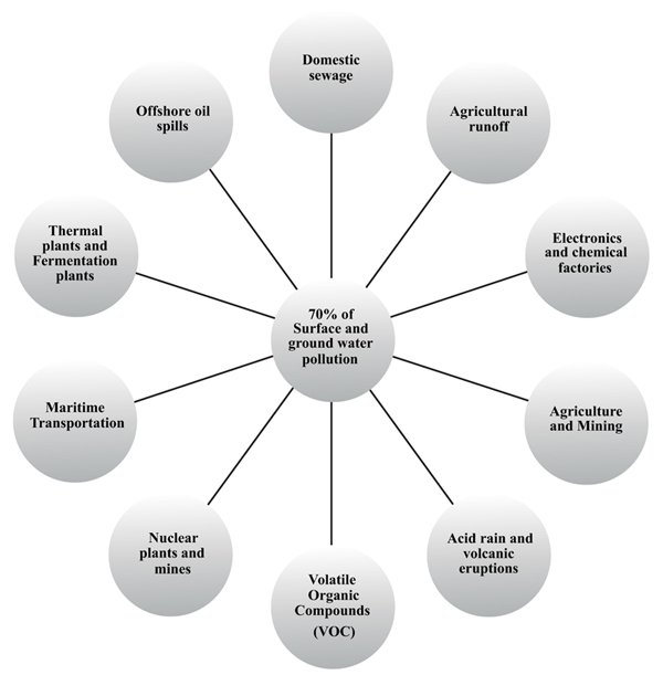 Urbanisation around the water bodies can be considered the primary culprit of 70% ground and surface water contamination. Natural sources of water pollution include open defecation by stray animals, an algal bloom in marine shores, volcanic eruption, and acid rains. Anthropogenic activities contributing to the deteriorating water quality include industrial effluent discharge, domestic sewage discharge, and oil spillage in marine oil refineries. Some of the significant contributors to surface and groundwater pollution are shown in Fig. (3).