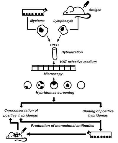 Achievements in fundamental immunology and modern biotechnology have made it possible to create a new generation of diagnostic drugs, such as monoclonal antibodies (mAbs). Kohler and Milstein [21] were the first to describe the production of hybridomas for immunodiagnostics capable of producing unlimited quantities of homogeneous populations of antibody molecules (Fig. 2). The advantages of mAbs are as follows: they are chemically pure reagents, identical in all parameters, capable of interacting with a unique antigen determinant, and available in unlimited quantities. Thus, using standard methods of working with cell cultures, it is possible to ensure an almost unlimited production. In the process of cloning and selection, a researcher can select hybridomas with desirable properties in terms of specificity of the interaction, affinity constants, and physicochemical properties that affect the possibility of their use in subsequent IHC analysis.
