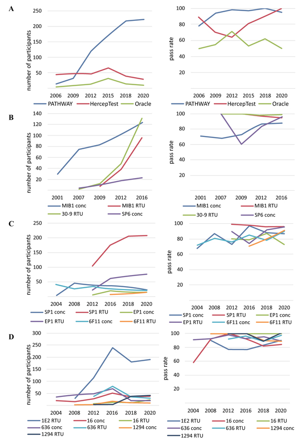Analysis of the NordiQC protocols for quality control assessment of the expression level of the HER2 tumour marker from 2006 to 2020 shows that the FDA/IVD-approved assays are PATHWAY (Ventana), HercepTest (Dako), and Oracle (Leica) (Fig. 3A). The RTU system PATHWAY (Ventana), based on rmAb 4B5, is the leading system of laboratory use and has a stable efficiency (pass rate 95–100%). Since 2012, the HercepTest has lost its leading position and tended to decline in terms of laboratory use for assessing HER2 status. The polyclonality of the antibodies used in HercepTest (pAb SK001) causes sharp fluctuations in the pass rate for the investigated period. Furthermore, very low application parameters for HER2 detection use (less than 5% of the laboratories) and efficiency (pass rate 50–71%) are noted for mAb clone CB11 of Oracle.