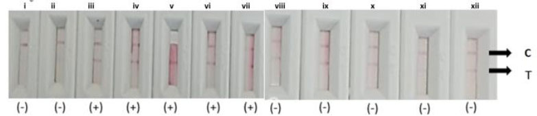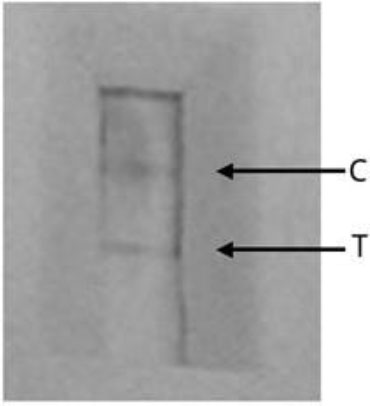 The rapid kits were subsequently tested with 5 μL solution containing Ag38-rec protein with concentration of 5.3 μg/mL as positive control and healthy human serum as negative control. The kits successfully identified the Ag38 recombinant protein in the positive control samples.