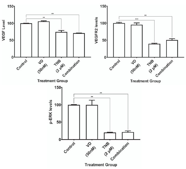In this study, we hypothesized that combining TNB and VDL would produce a significant synergistic effect on the MAPK/ERK pathway inhibition. In addition, the effect on the levels of p-ERK, VEGF, and VEGFR was assessed.