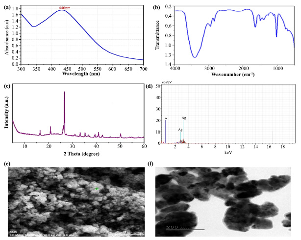 Optical characterization of green synthesised AgNPs: (a). UV- Vis Spectrum shows the wavelength of Silver, (b). FT-IR shows the functional groups of plant chemical constituents that bind with the silver, (c). The spectrum of XRD, (d). Spectrum of Energy-dispersive X-ray spectroscopy (EDX) and (e-f). SEM and TEM images show the morphology of particle