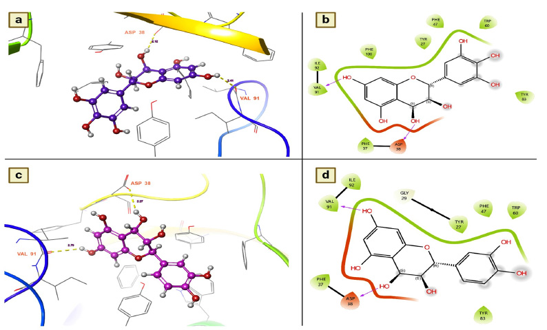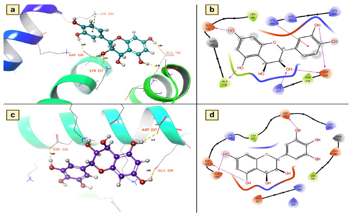 (a and b). Leucocianidol shows the residues and hydrogen bond contacts with Salivary protein 34k2 of Aedes albopictus; (c and d). Leucodelphidin shows the residues and hydrogen bond contacts with the salivary protein 34k2 of Aedes albopictus.
