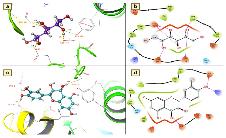 (a and b). Mannitol shows the residues and hydrogen bond contacts with Odorant-binding protein 1 of Aedes albopictus; (c and d). Leucodelphidin shows the residues and hydrogen bond contacts with the Odorant-binding protein 1 of Aedes albopictus.
