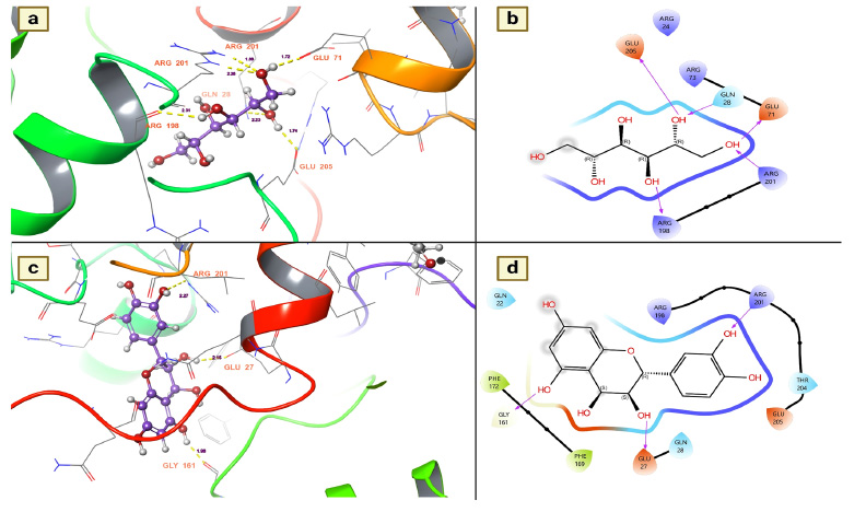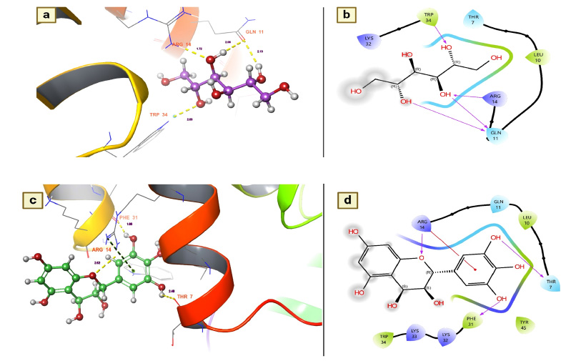 (a and b). Mannitol shows the residues and hydrogen bond contacts with Juvenile hormone; c and d). Leucodelphidin shows the residues and hydrogen bond contacts with the Juvenile hormone.