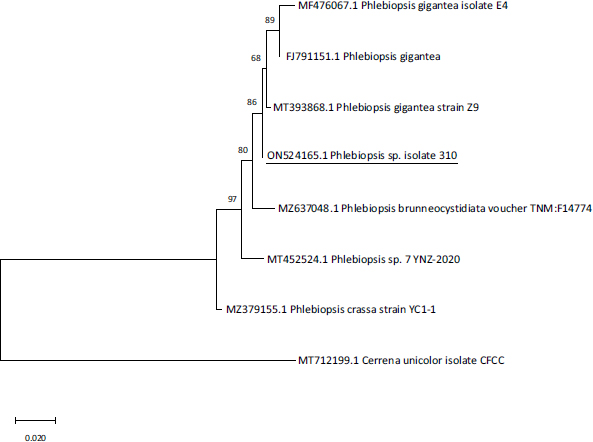 The isolated fungus was identified as Phlebiopsis sp. (310 bp). Fig. (3) depicts the Neighbor-Joining approach, which was used to determine the evolutionary history of Phlebiopsis sp. The Tamura 3-parameter approach was used to compute evolutionary distances, which are expressed as base substitutions per site. The first, second, third, and noncoding codon positions were all included. The bootstrap consensus tree built from 500 iterations depicts the evolutionary history of the organisms under study. Branches from partitions that have been replicated in fewer than half of the bootstrap replicates are collapsed. Next to the branches are the percentages of duplicate trees in which the related species grouped in the bootstrap test (500 repetitions) [18, 37].