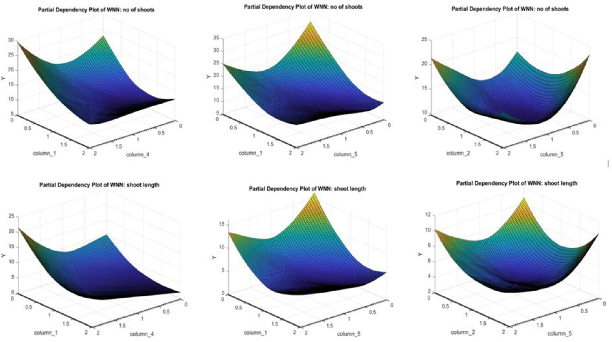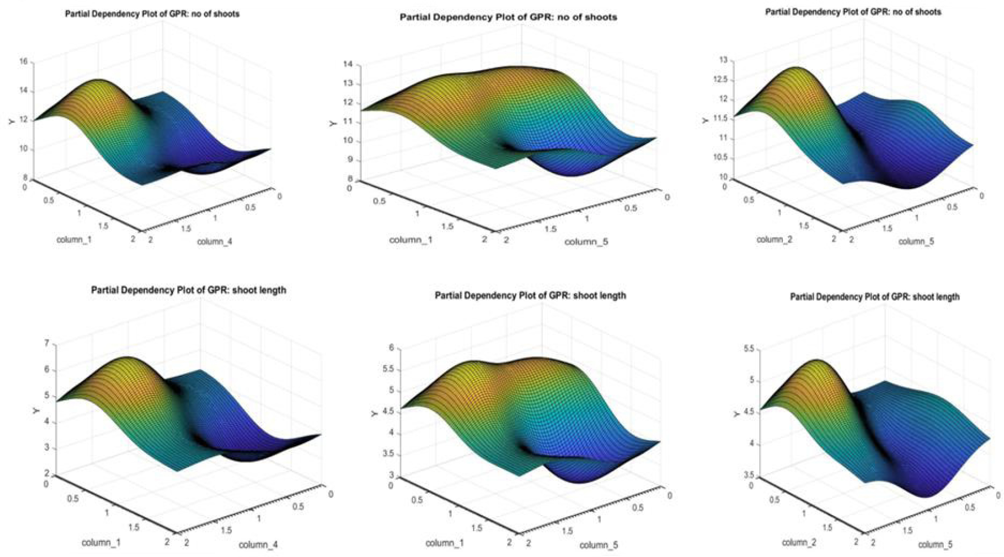 The results of the output modelling demonstrated that the GPR model exhibits superior accuracy compared to the MLP-ANN model. The model GPR has a percentage accuracy of 99.981 for the number of shoots and 99.885 for the shoot length. On the other hand, the ANN model has an accuracy percentage of 99.825 for the number of shoots and 97.582 for the shoot length. The partial dependence plot further illustrates the relationship between the concentration of macronutrients and the number and length of shoots.