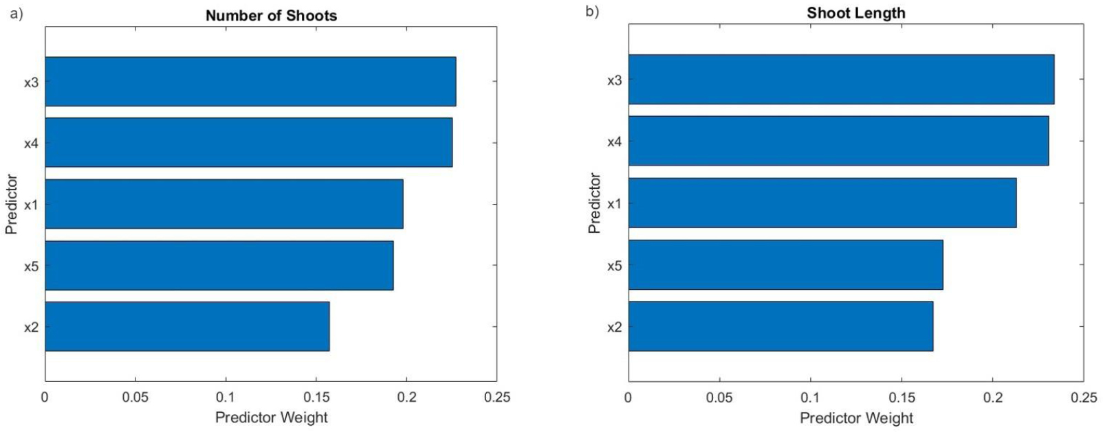 Number of Shoots: In the left chart, predictor x3 and x4 are shown to have the most significant weight, indicating they play the largest role in predicting the “Number of Shoots.” Predictors x1 and x5 also have notable weights, whereas x2 is less influential. Shoot Length: In the correct chart, predictors x3 and x4 again have the highest weight, underscoring their substantial impact on “Shoot Length.” Predictors x1 and x5 maintain considerable weights, similar to their influence on the “Number of Shoots,” while x2 remains the least significant. These charts consistently highlight predictor x3 and x4 as the key factors affecting both the “Number of Shoots” and “Shoot Length,” with x2 being the least impactful. This analysis is crucial for identifying the most significant input features in predicting specific outcomes within the model.