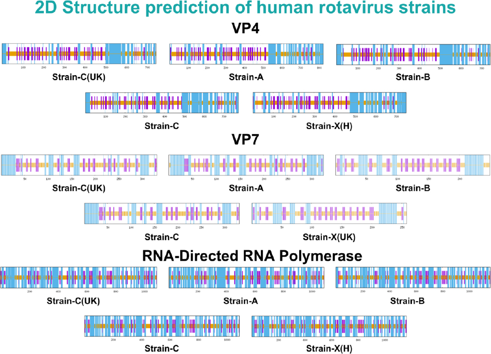 Lastly, RNA-directed RNA polymerase proteins VP4 and VP7, and their secondary structures, were predicted using SOPMA. The analysis showed varying secondary structure elements in proteins, with the outer capsid proteins VP4 and VP7 having alpha-helix contents ranging from 30.78% to 36.52% and 27.31% to 35.58%, respectively. Notably, the RNA-directed RNA polymerase showed a higher alpha-helix content, ranging from 51.47% to 52.57%. Moreover, VP4 and VP7 had varying extended strand content, ranging from 17.81% to 26.91%, and RNA-directed RNA polymerase from 12.50% to 13.30%. The random coil ratios were high in all three proteins, ranging from 35% to 48%. Notably, no beta-turn structures were observed in any of the proteins analyzed. The secondary structures and their respective ratios in all strains of these three proteins are listed in Table 3. The secondary structures of all human strains of VP4, VP7, and RNA-directed RNA polymerase are illustrated in Fig. (2).