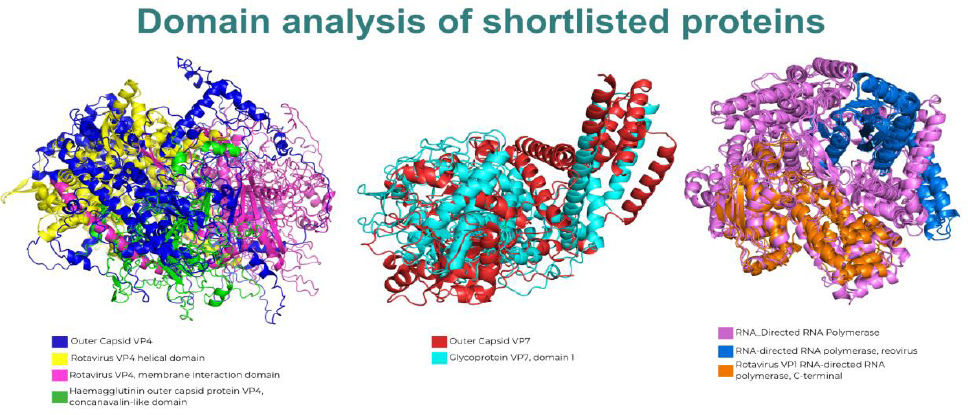 A domain analysis of the shortlisted proteins was conducted using the InterPro database to identify key functional regions. The results, summarized in Table 4, reveal significant architectural differences among human rotavirus strains, as visualized in the superimposed structures shown in Fig. (3).