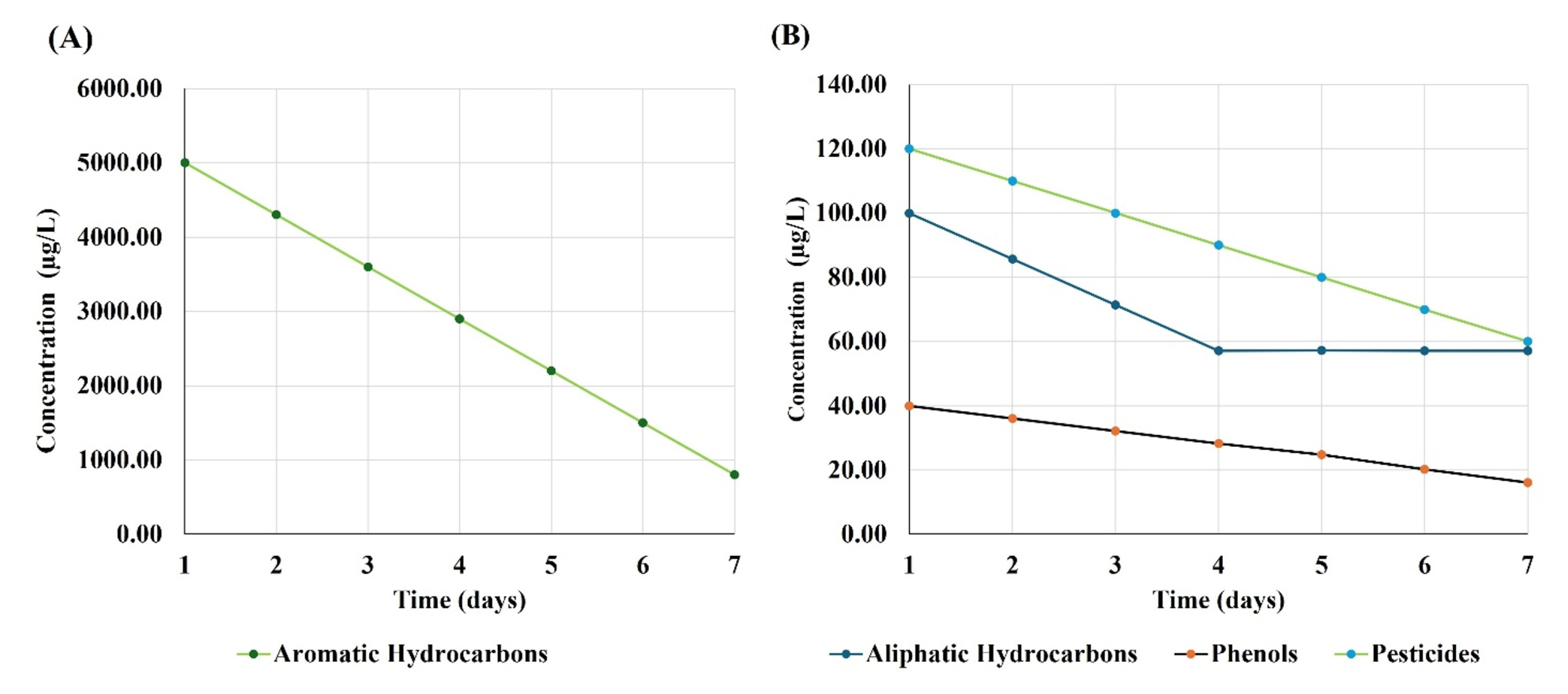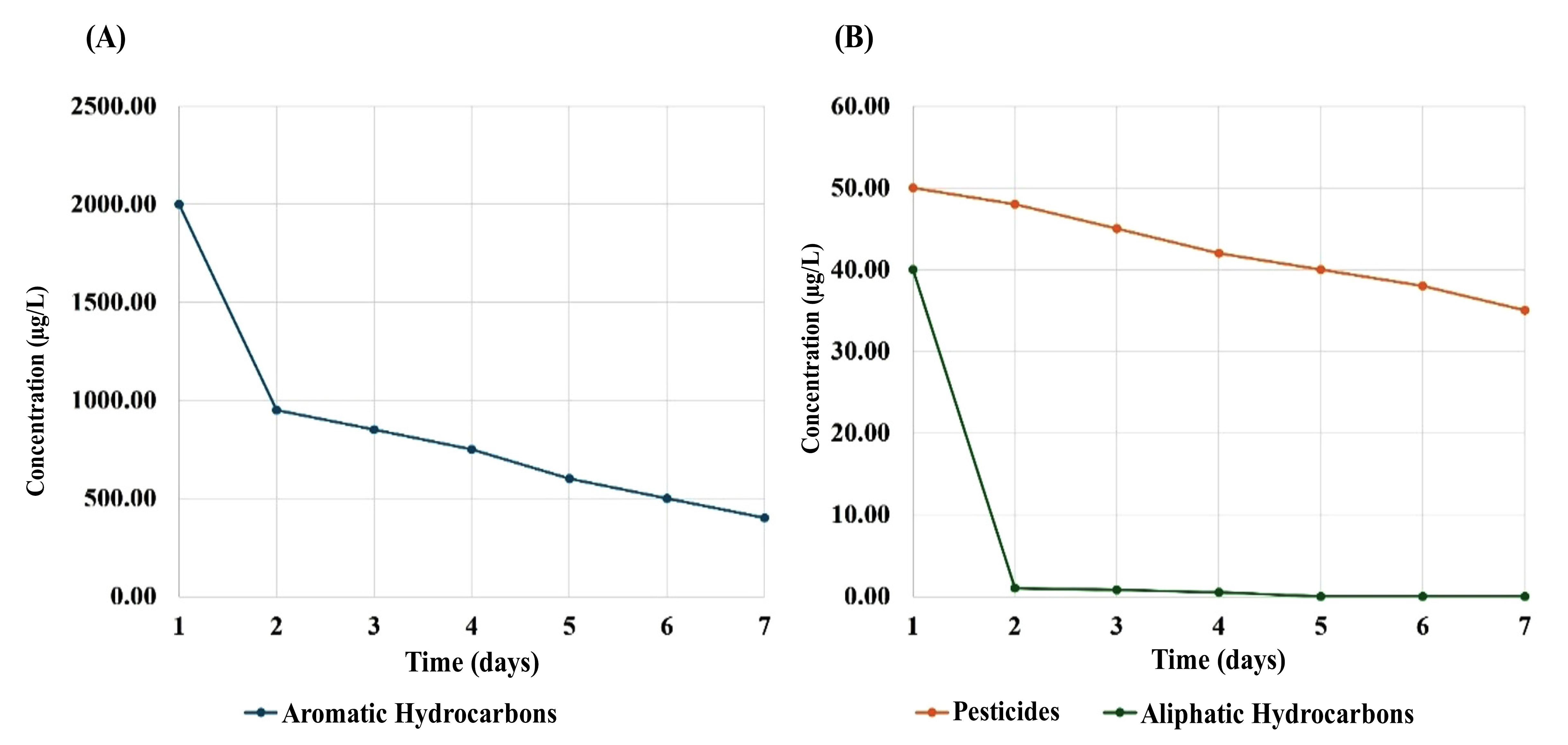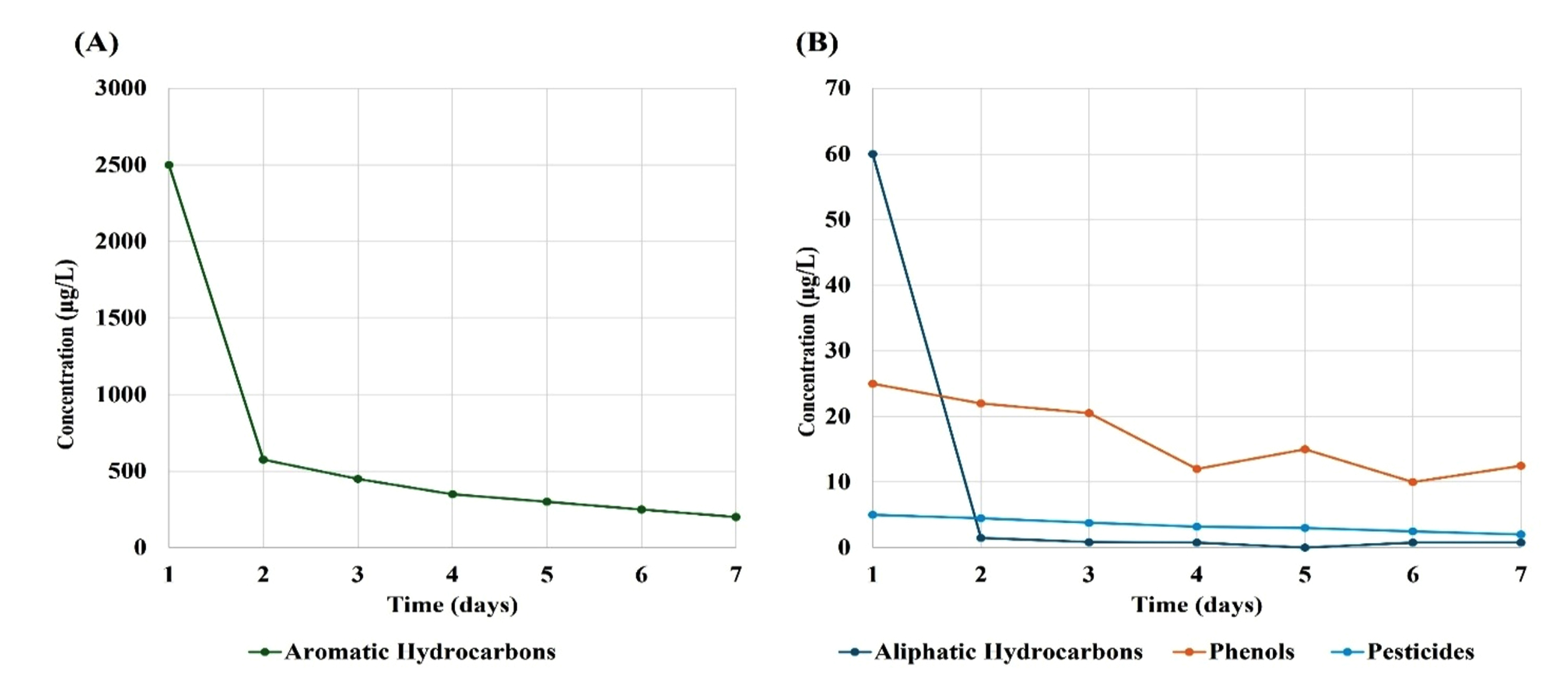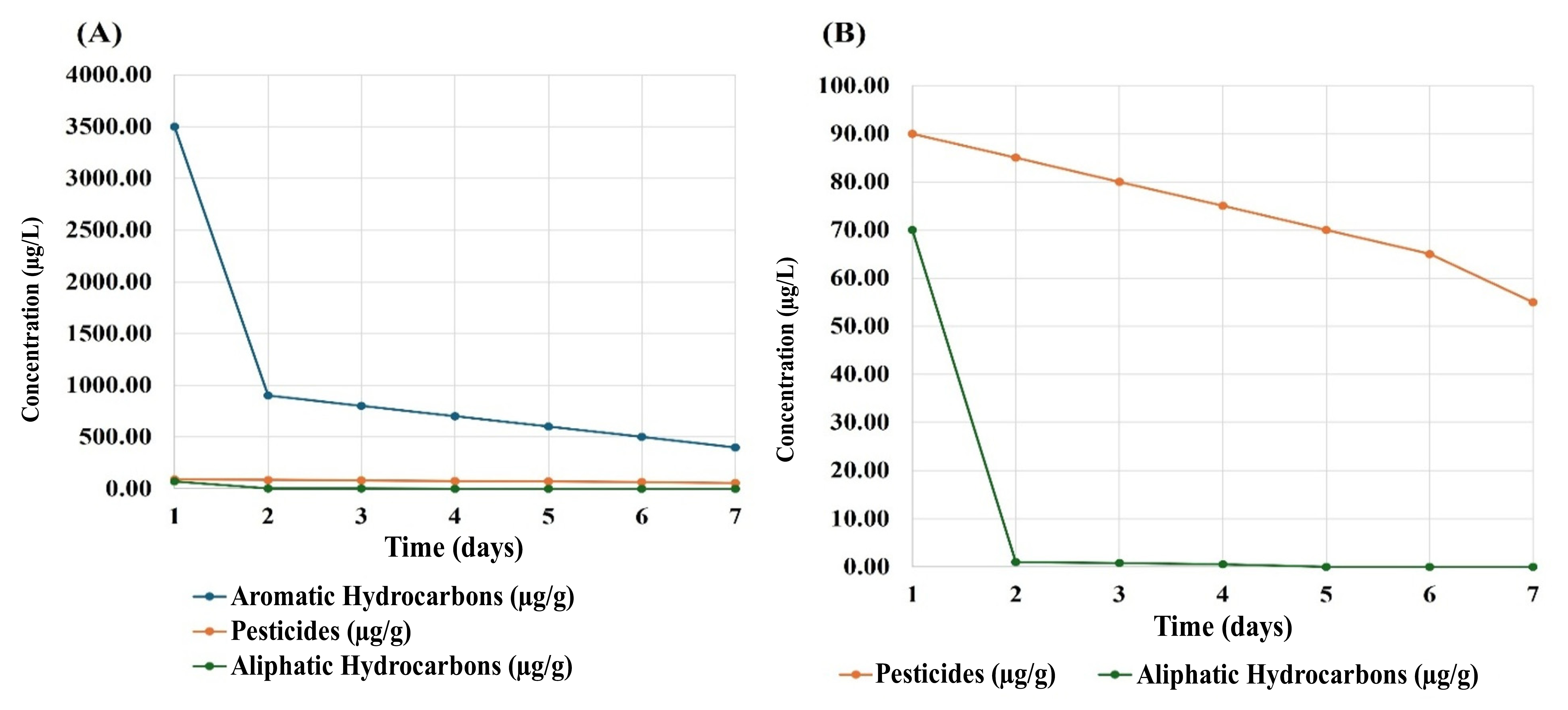 Changes in concentrations of the organic contaminants found in the treated water from the Southern Hammar marshes (site 4). The x-axis represents time (days), and the y-axis represents contaminant concentration (µg/L). (A) Aromatic hydrocarbons, aliphatic hydrocarbons, and pesticides (from a concentration scale of 0 to 4000 µg/L); (B) aliphatic hydrocarbons and pesticides (from a concentration scale of 0 to 100 µg/L).