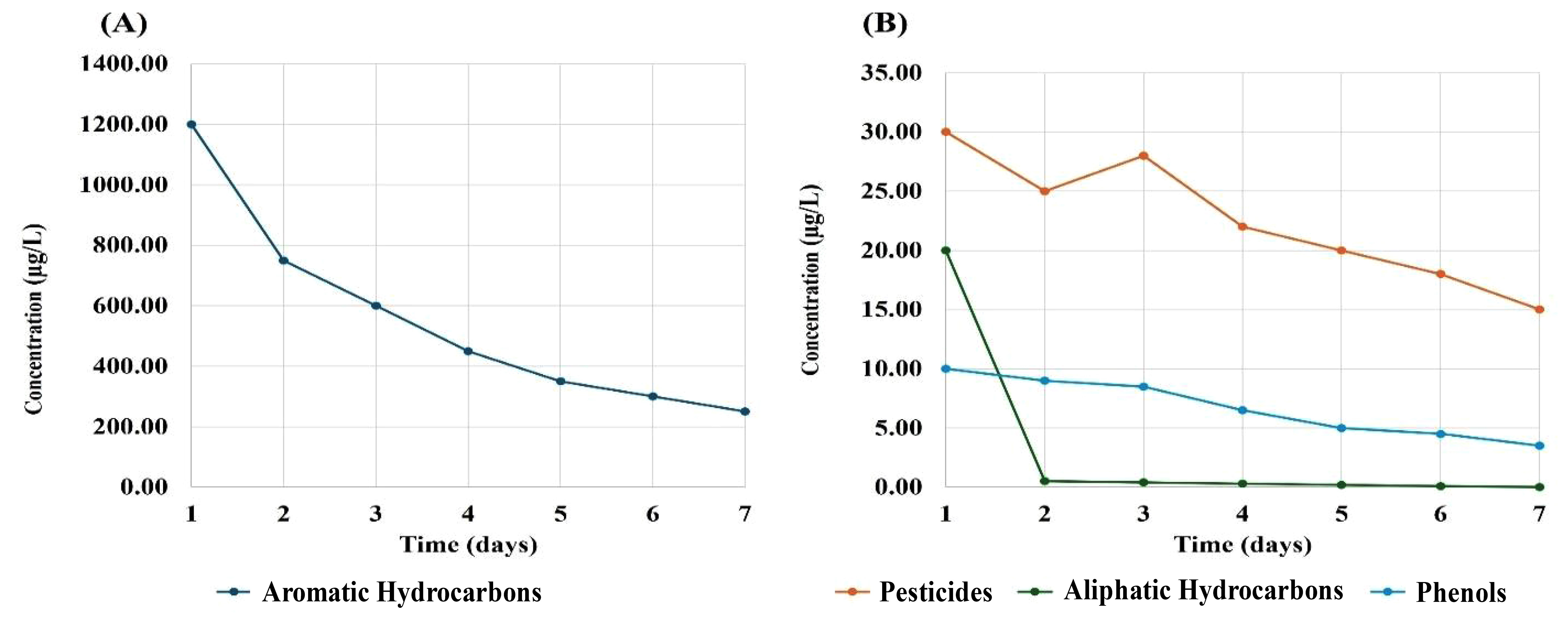 Changes in concentrations of the organic contaminants found in the treated water from the Hawizeh marshes (site 3). The x-axis represents time (days), and the y-axis represents contaminant concentration (µg/L). (A) Aromatic hydrocarbons; (B) aliphatic hydrocarbons, phenols, and pesticides.