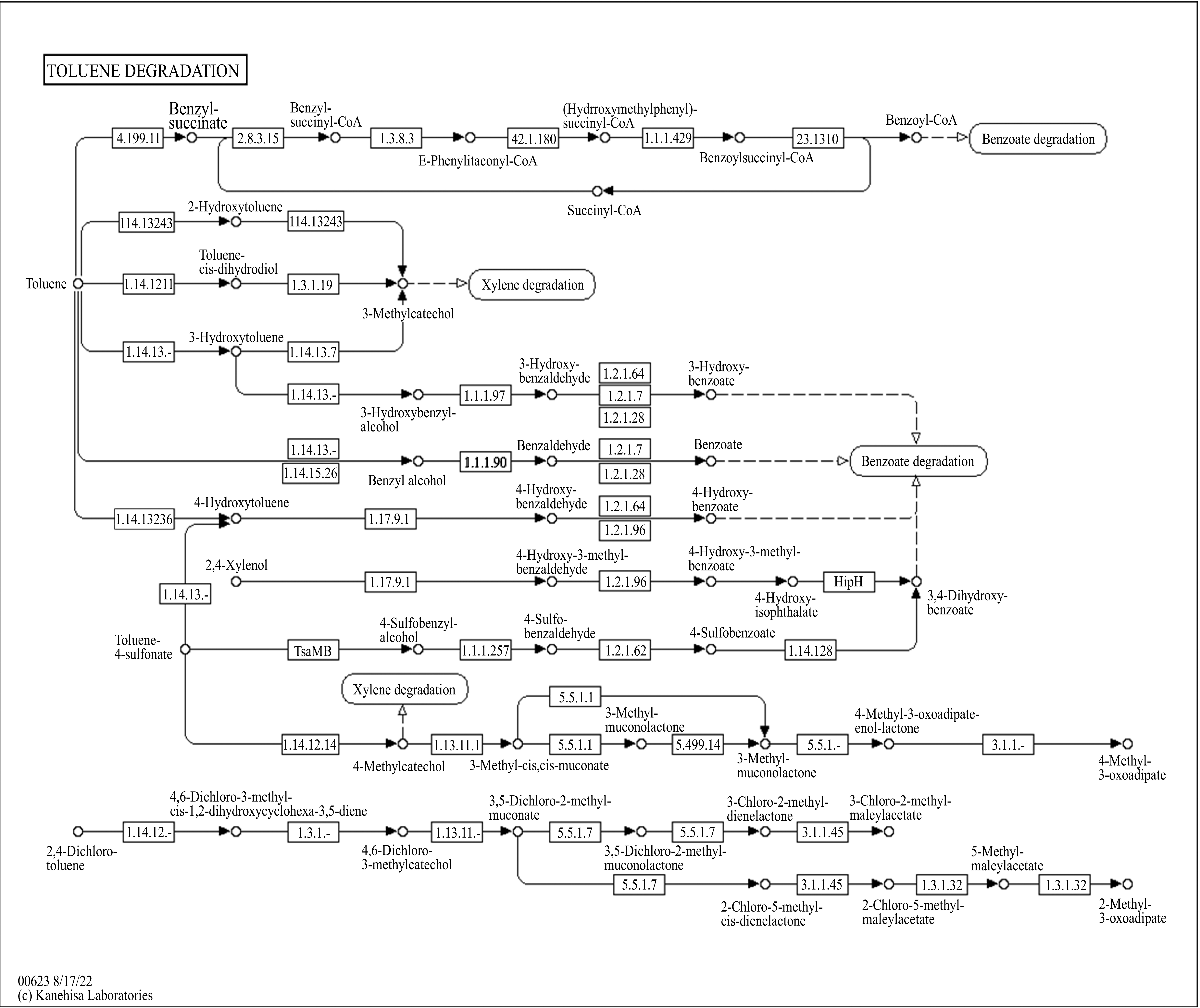 xylA – toluene monooxygenase xylB – benzyl alcohol dehydrogenase xylC, xylD, etc. – enzymes for further degradation steps |